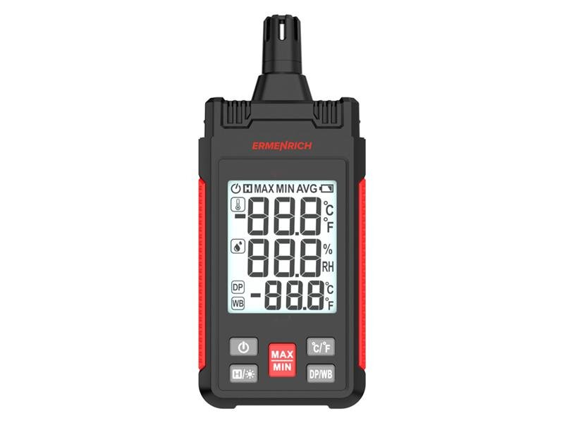 Termohygrometr Ermenrich Wett TU20 je přenosný přístroj pro monitorování mikroklimatu na pracovišti, v práci nebo doma. Umožňuje rychle měřit změny teploty a vlhkosti ve vnitřním i venkovním prostředí. Teploměr měří teploty v rozsahu -20 až +60 °C. Přístroj můžete také nastavit tak, aby zobrazoval naměřené hodnoty ve stupních Fahrenheita. Vlhkoměr měří vlhkost v rozsahu 0-100 % a určuje rosný bod. K dispozici je funkce přidržení zobrazení naměřené hodnoty a ukládání minimálních a maximálních hodnot.Vyžaduje 3 baterie AAA (nejsou součástí sady). Indikátor vybitých baterií ukazuje, kdy je třeba napájecí zdroj vyměnit. Funkce automatického vypnutí pomáhá šetřit energii baterií.