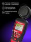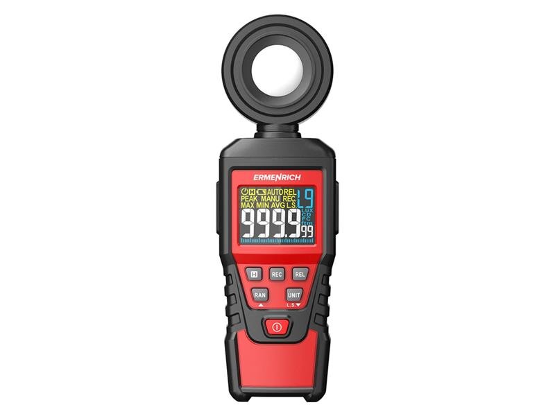 Digitální luxmetr Ermenrich Seek MX20 je určen k měření úrovně osvětlení. Měření je k dispozici v různých jednotkách luxů a stopových kandel. Rozsah měření lze nastavit ručně nebo automaticky, stejně jako zvolit typ světelného zdroje. K dispozici jsou také funkce přidržení zobrazení naměřené hodnoty, ukládání mezních a průměrných hodnot a relativní měření. Kromě zobrazení na displeji zobrazuje úroveň osvětlení grafická stupnice.Vyžaduje 3 baterie AAA (nejsou součástí sady). Na nízkou úroveň kapacity baterie upozorňuje indikátor na displeji. Přístroj se automaticky vypne po 10 minutách nečinnosti.