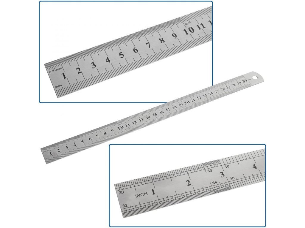 Pravítko nerezové, s metrickou stupnicí 0 - 30 cm a palcovou stupnicí 0 - 12 inch.