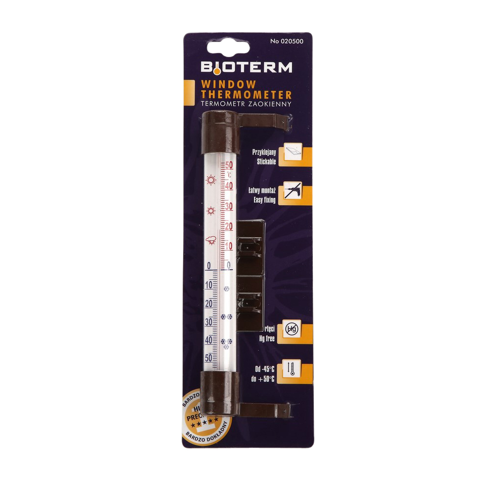 Okenní teploměr. Má speciální tipy s lepicí páskou pro připevnění teploměru (bez vrtání) k okenním rámu z plastu, hliníku nebo dřeva. Teploměr lze také přišroubovat. Rozsah měření od -50 °C do + 50 °C. Tolerance do +/- 1 °C. Rozměry - výška 23 cm, šířka 3 cm, celková šířka 6,5 cm.