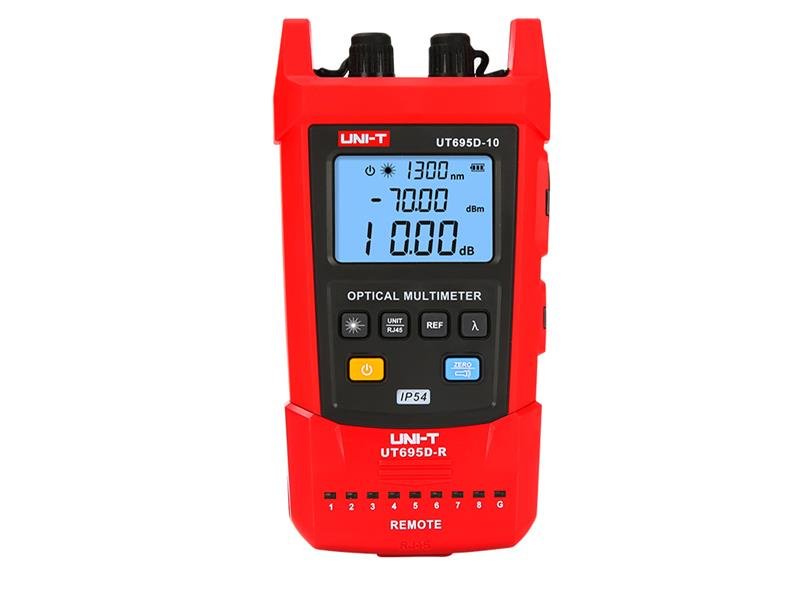 Ruční mini optický multimetr UT695D-10 v sobě integruje tři funkce: měření výkonu optického signálu, detekci kontinuity optických vláken a test pořadí vodičů v kabelech LAN. Přístroj má ergonomický design a vysokou odolnost proti prachu a vodě (krytí IP54) a je určený pro profesionální použití při výstavbě a údržbě optických telekomunikačních sítí. Přístroj má zabudované univerzální optické konektory FC / SC / ST. V levém konektoru je výstup laserového zdroje s vlnovou délkou 650nm a optickým výkonem 10mW, což stačí na měření optických kabelů s délkou až 10km a detekci poruch na těchto kabelech. Pravý optický konektor je vstup měřiče optického výkonu na kalibrovaných vlnových délkách 800 až 1700nm s detektorem lnGaAs. Na tomto vstupu dokáže optický multimetr automaticky identifikovat modulační frekvenci 0 Hz, 270 Hz, 1000 Hz a 2000 Hz vyzařovanou světelným zdrojem. Lze měřit absolutní výkon přicházejícího paprsku v lineárních hodnotách (v nW, μW, mW) nebo logaritmických hodnotách (v dBm). Také lze měřit relativní výkonové ztráty na optickém vlákně nebo pasivních optických prvcích. Přístroj má ultra široký rozsah testování optického výkonu, automatickou identifikaci frekvence modulace světla, automatické vypnutí, paměť vlnových délek, uživatelskou kalibraci, podsvícení displeje, zabudovanou LED svítilnu. Pro testování metalických vedení LAN má hlavní jednotka i oddělitelná přijímací část konektory RJ45 s řadou devíti indikačních LED. Zařízení odpovídá normám EN61326-1: 2013 a EN61326-2-2: 2013.