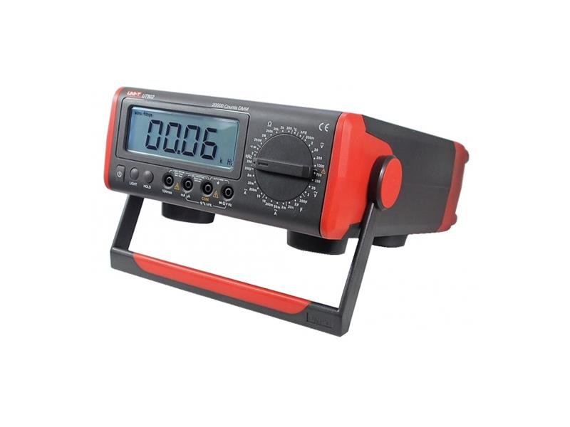 Stolní multimetr UT802 je víceúčelový elektronický měřicí přístroj. Splňuje s vysokou přesností a pohodlností obsluhy potřeby měření elektrických parametrů při údržbě elektronických zařízení. Výhodou je mnoho funkcí a možnost použití i mimo dosah napájecího napětí 230V, protože umožňuje také práci na baterie. Přístroj má podsvětlený LCD displej se zobrazitelnou hodnotou ±19999. Přístroj je vyroben dle standardů IEC61010-1 a vyhovuje kategorii CAT II 1000V.
