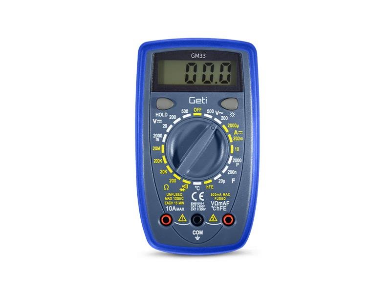 Multimetr GETI GM33C nalezne své uplatnění při měření široké škály elektrických veličin jako jsou například: napětí (DCV a ACV), proud (DCA), odpor, kapacita a mnoho dalších. Přehledný displej doplněný o podsvícení, zajišťuje snadnou a přesnou čitelnost naměřených hodnot i za horších světelných podmínek. Přístroj je také vybaven dalšími praktickými funkcemi, jako je indikace slabé baterie, ochrana proti přetížení, testování diod, měření kontinuity nebo testování tranzistorů, které dodávají multimetru uživatelsky přívětivý charakter, který díky kompaktním rozměrům a nízké hmotnosti zaručuje snadnou manipulaci i v těžko přístupných místech. Všechny tyto vlastnosti z tohoto přístroje činí všestranného pomocníka, nejen v dílnách, ale i domácnostech.