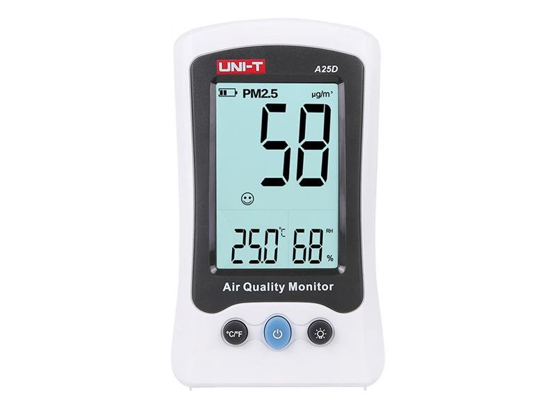 A25D je stolní monitor kvality ovzduší používaný k monitorování koncentrace PM2,5 v domácnostech, nákupních centrech, kancelářích...atd. Atmosferické částice (PM) jsou mikroskopické pevné nebo kapalné látky suspendované v atmosféře Země, které mohou nepříznivě ovlivnit lidské zdraví. Látky PM2,5 jsou částice znečišťující ovzduší (prach, aerosoly) s průměrem 2,5 μm nebo méně, které obsahují saze, kouř, kovy, dusičnany, sírany, prach, vodu a gumu z pneumatik. Částice PM2,5 se mohou dostat hluboko do našich plic a některé dokonce až do krevního řečiště. Vystavení se jemným částicím může ovlivnit činnost srdce a plic.
