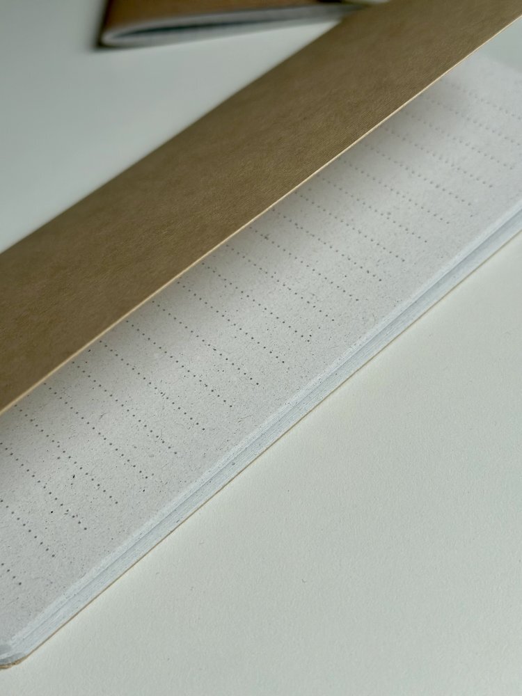 Papír, ze kterého je vyrobený jsme pečlivě vybíraly. Desky diáře jsou vyrobené z jemně hnědého papíru s příjemnou strukturou a vysokou gramáží. Papír uvnitř je jemně zašedlý a recyklovaný. Má gramáž 160 g/m2 a skvěle snese pera, fixy, tužky i rollery.