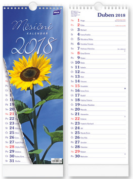 Měsíční nástěnný kalendář na rok 2018, bez obrázků. Na stránce kalendáře jsou označené státní svátky, jmeniny, název aktuálního měsíce, fáze měsíce. Kalendář je opatřený kroužkovou vazbou se závěsem. Možnost dotisku firemního loga a textu na spodní stranu kalendáře. číst celé