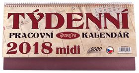 Nový týdenní plánovací kalendář na rok 2018 v retro stylu. Kalendář je svázán kovovou černou vinutou spirálou. Stojánek kalendáře je z tvrdého kartonu a zaručuje stabilitu kalendáře. Kalendárium je sloupcové a můžete do něj napsat Vaše pracovní činnosti od 7:00 do 16:00, nebo si časy přizpůsobit. Týdenní kalendárium obsahuje také víkendové dny sobotu a neděli. Máte zde prostor pro Vaše plánování. Na každém listu naleznete měsíční přehled s čísly týdnů v měsíci. Dále je v týdenním kalendáriu malý prostor pro stručné poznámky. Na prvních stranách Retro kalendáře je přehledný Plánovací kalendář na dvě pololetí. Na další stránkách přhledný kalendář svátků jmen a státních svátků pro roky 2018 a 2019.