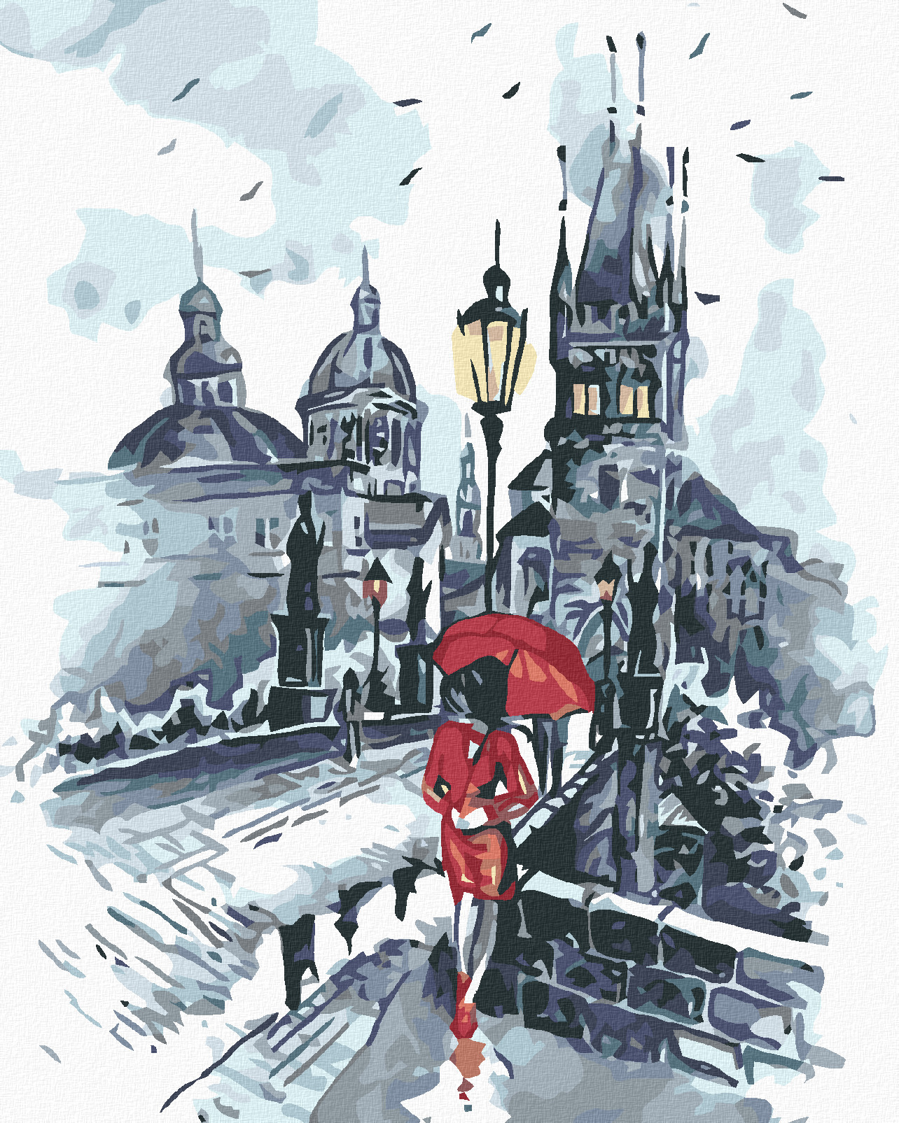 Malování podle čísel - ŽENA S DEŠTNÍKEM NA KARLOVĚ MOSTĚ - 80x100 cm, bez rámu a bez vypnutí plátna