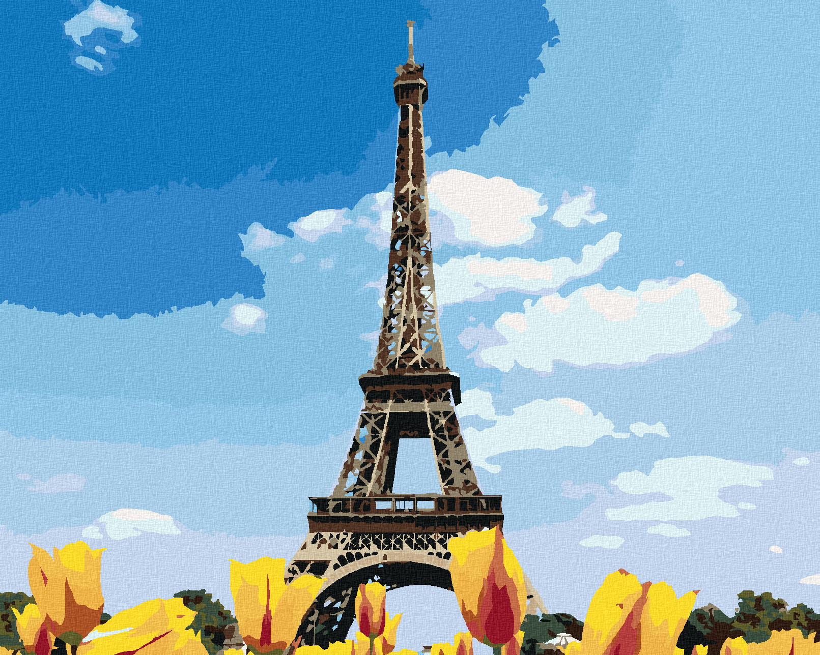 Malování podle čísel - EIFFELOVA VĚŽ A TULIPÁNY - 80x100 cm, bez rámu a bez vypnutí plátna