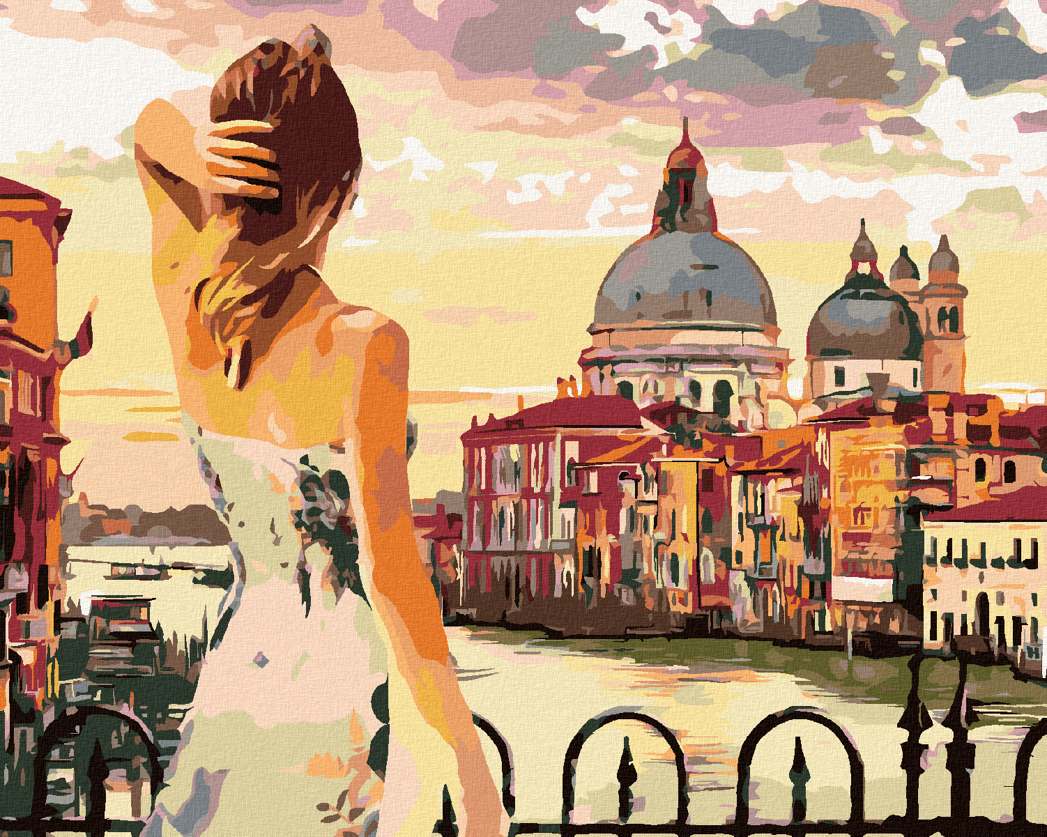 Malování podle čísel - ŽENA V BENÁTKÁCH PŘI ZÁPADU SLUNCE - 80x100 cm, bez rámu a bez vypnutí plátna