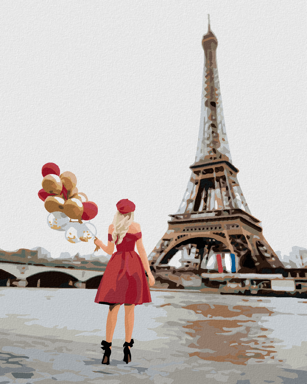 Malování podle čísel - EIFFELOVA VĚŽ A ŽENA S BALÓNKY - 40x50 cm, bez rámu a bez vypnutí plátna
