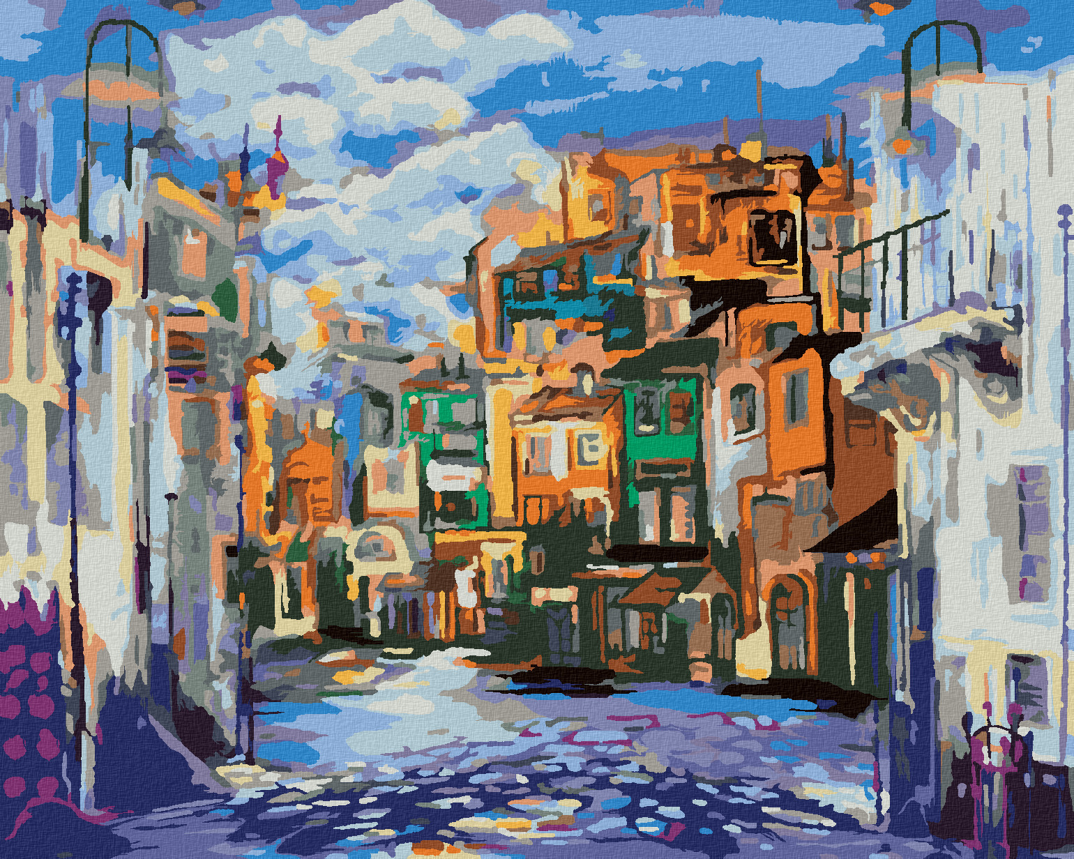 Malování podle čísel - NEPŘÍZNIVÉ POČASÍ V MALÉM MĚSTEČKU - 80x100 cm, bez rámu a bez vypnutí plátna