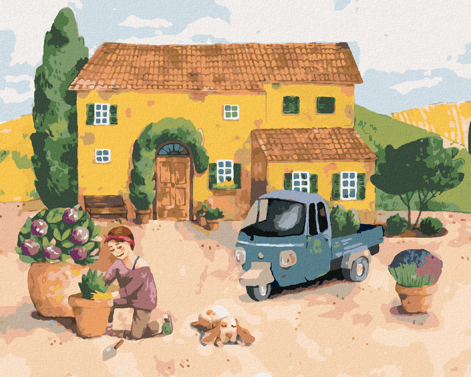 Malování podle čísel - ŽENA SADÍCÍ KVĚTINY U DOMU V PROVANCE - 40x50 cm, bez rámu a bez vypnutí plátna
