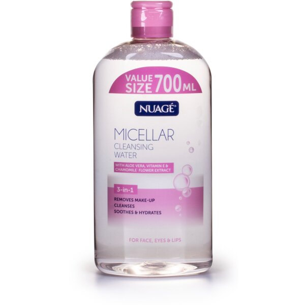Nuage - Micerální pleťová voda 3v1 - 700mlMicerální, čistící voda na obličej, oči a ústa s Aloe vera, vitamínem E a výtažky z heřmánku. Odstraní make-up, vyčistí a hydratuje pokožku. Bez parabenů, barviv a parfemace.