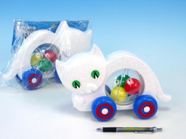 Kočka s míčky tahací plast 27x16x10cm v sáčku 12m+
