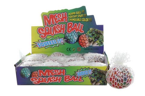 Antistresový mačkací míček v síťce,ze které vylézá hmota. Rozměr cca 8 cm. Věk 3+ číst celé