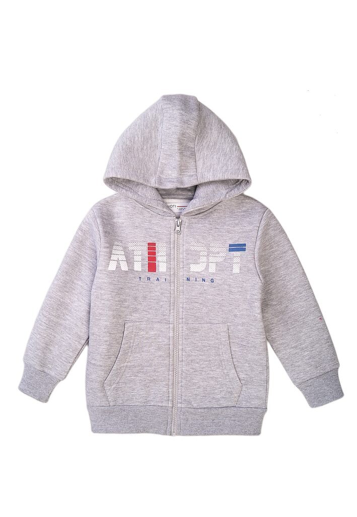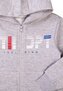 Mikina s kapucí, zapínáním na zip, předními kapsami a středovým potiskem.