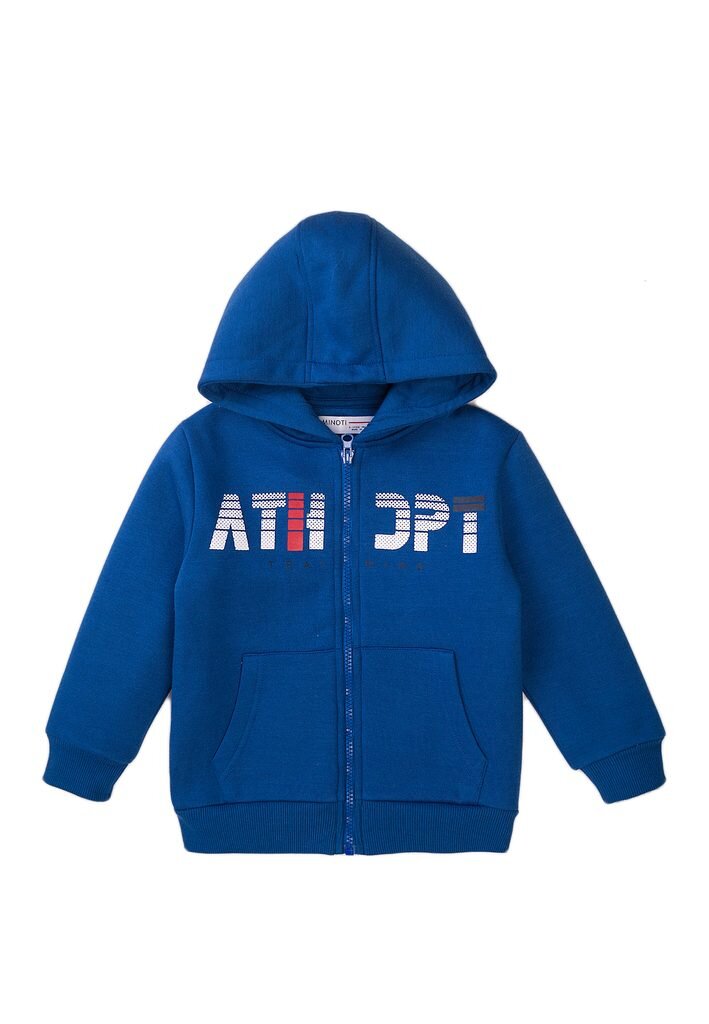 Mikina s kapucí, zapínáním na zip, předními kapsami a středovým potiskem.