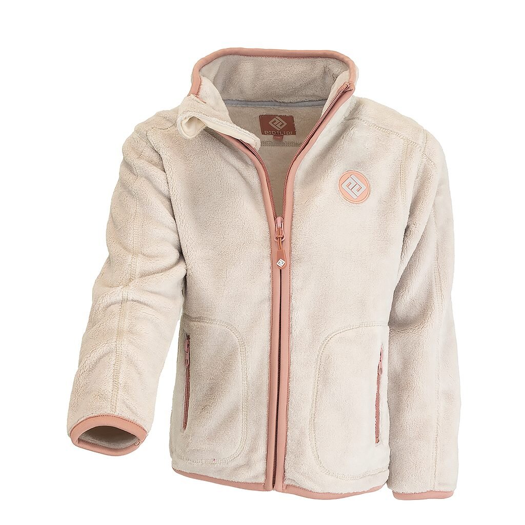 Dětská propínací chlupatá mikina v béžové barvě. Stojací límec, dvě kapsy, barevné kontrastní lemy.