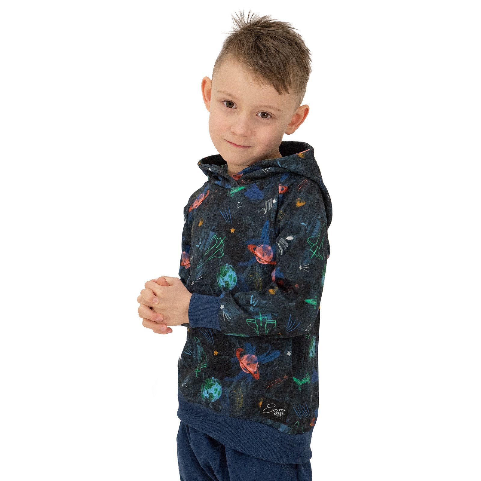 Dětská mikina s kapucí Universe. Designový kousek, který nesmí chybět v šatníku žádného špunta. Vyšší gramáž, teplákovina v certifikované kvalitě s digitálním potiskem. Díky 5% elastanu zůstává mikina tvarově perfektní i po mnoha vypráních. Přitom 95% bavlny zaručuje příjemné nošení v ještě lepším komfortu. Dvouvelikostní mikina vydrží na delší čas.