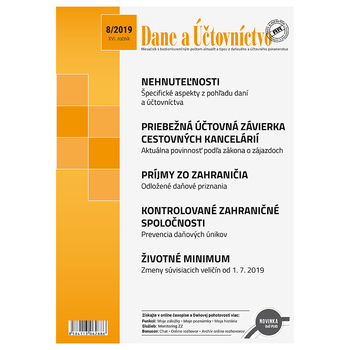 Letné vydanie publikácie Dane a účtovníctvo 8-2019 prinášame opäť množstvo praktických tém, ako napríklad - Podanie daňového priznania fyzických osôb z príjmov zo zahraničia, kde je dôležitý dátum 30. 9. 2019 pre všetkých, ktorí si odložili daňové priznanie a pracovali v zahraničí. Tentokrát sme neopomenuli ani oblasť nehnuteľností, kde sa zameriavame na príjmy z prenájmu. V článku analyzujeme prenájom aj z aspektu bezpodielového spoluvlastníctva, uplatňovania