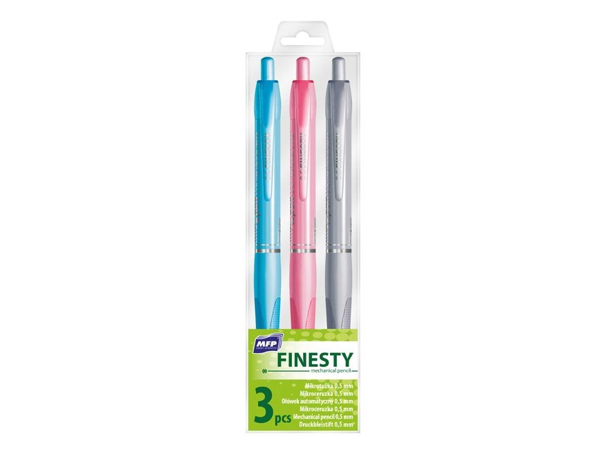 Set 3 ks - mechanické mikrotužky značky Finesty tzv. pentilka s tuhou 0,5 mm. V horní části tužky se schovává pod vrškem mazací pryž. Tužka je opatřena plastovým klipem.