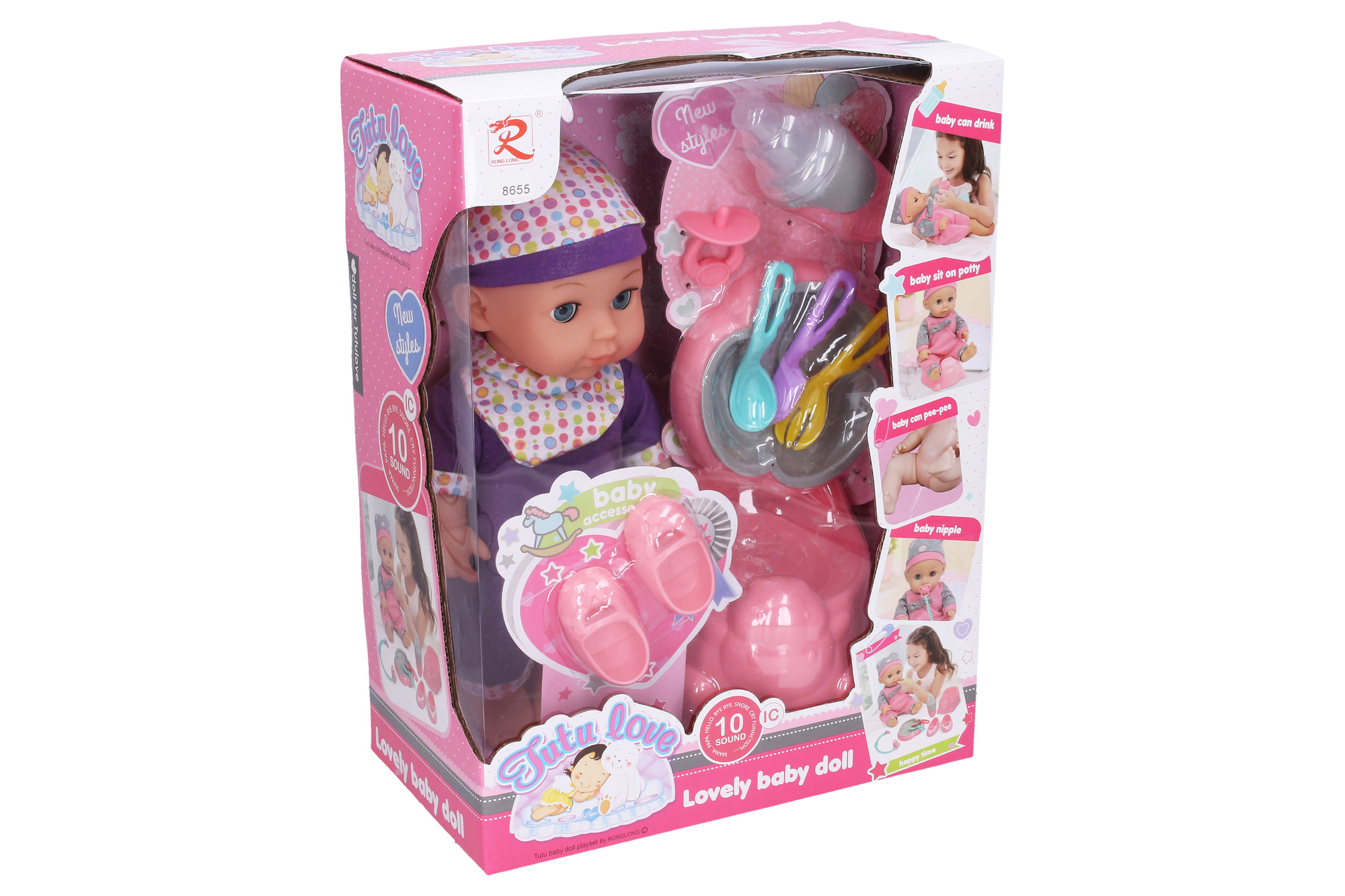 - Příslušenství: panenka, nočník, talířek, příbor, lahvička, dudlík