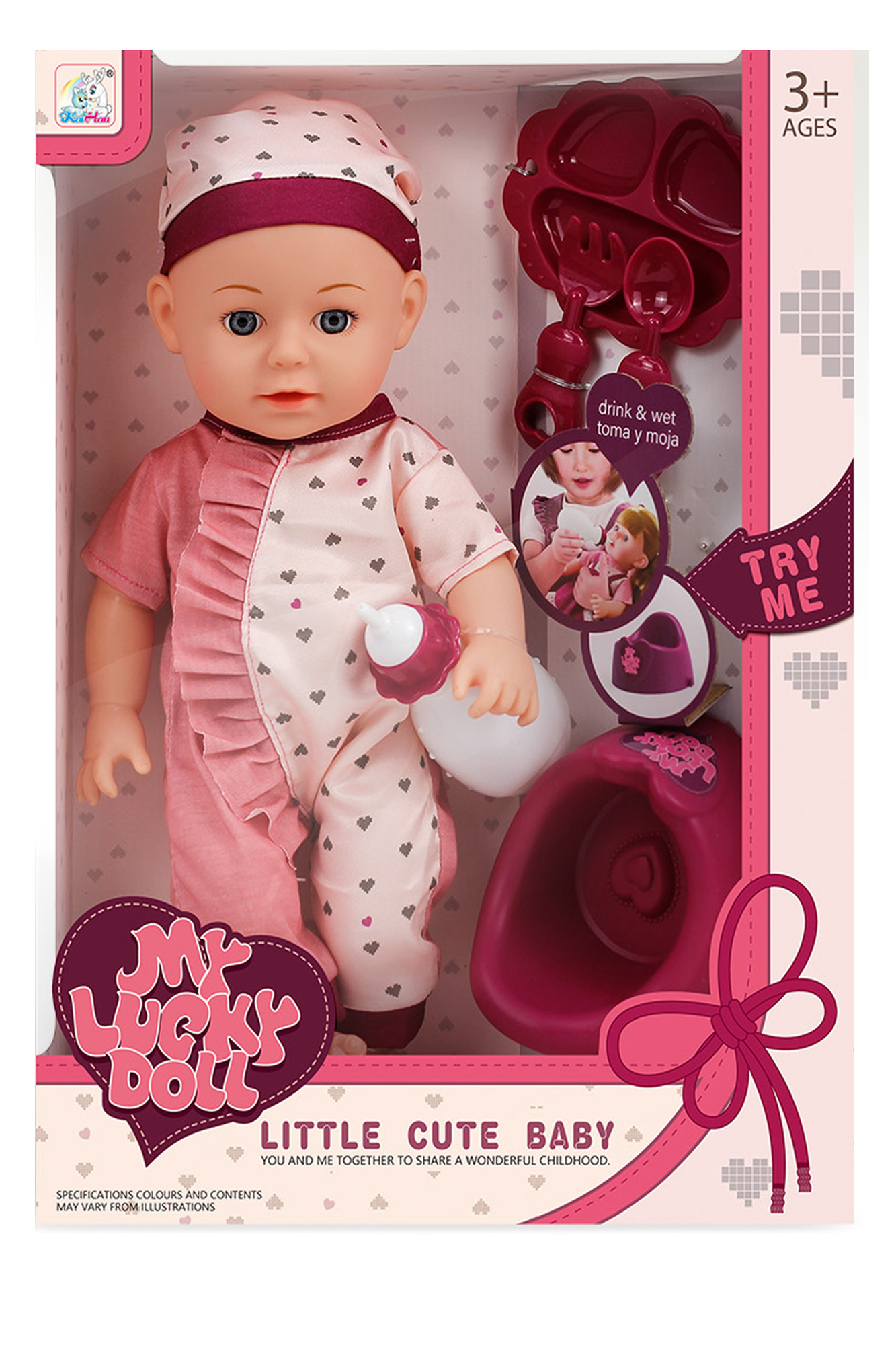 Miminko čurající set. Velikost 25 cm. Zvukové efekty. 3xAG13 baterie součástí. Láhev, nočník, miska, lžíce součástí.