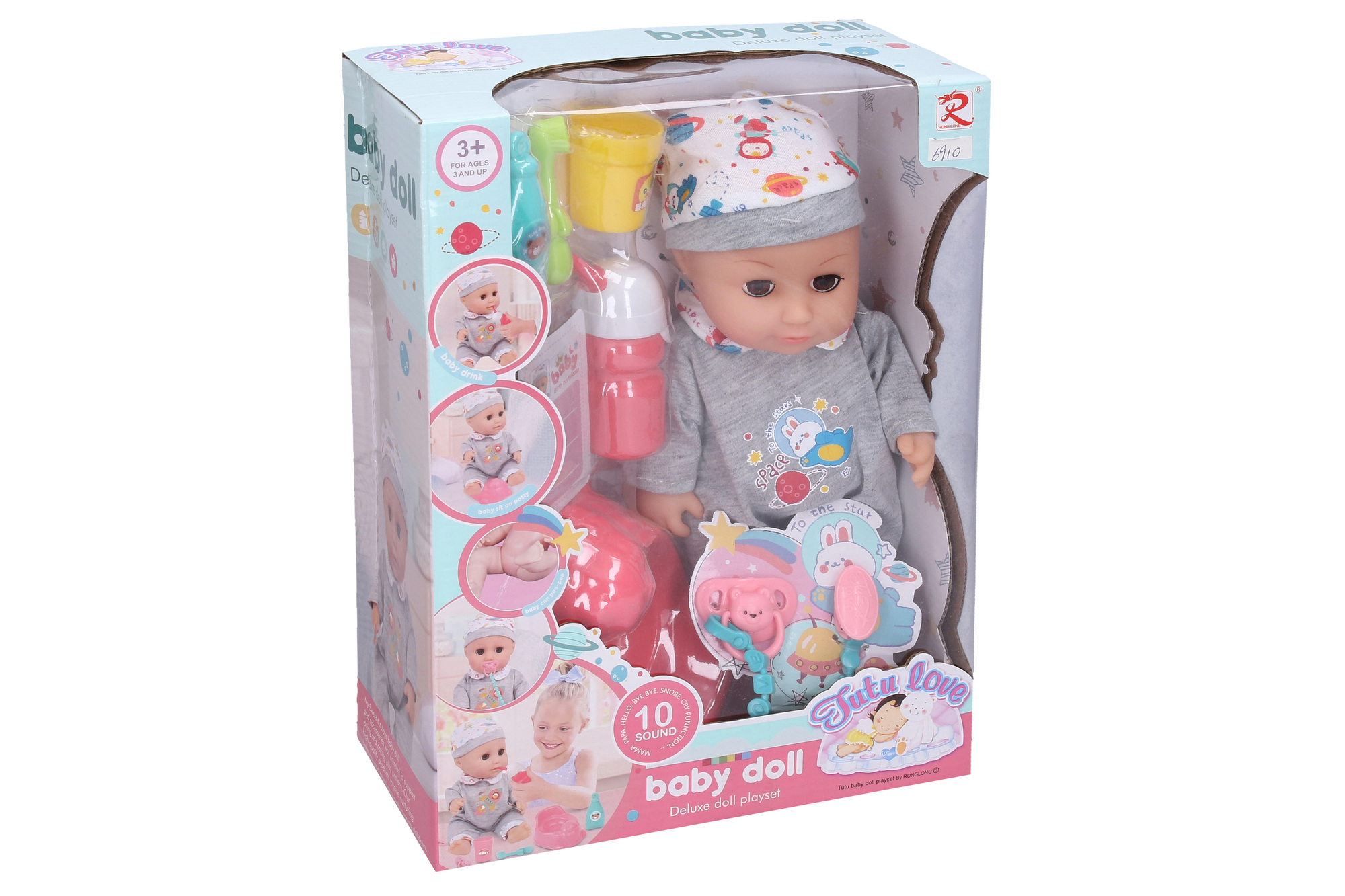 Miminko čurající. Velikost 30cm. Miminko pije z lahvičky, čurá, vydává zvuky. Obsahuje: panenku, dudlík, nočník, lahvičku, kelímek, kartáček, rodný list, pastu na zuby. 3xAG13 baterie součástí balení.