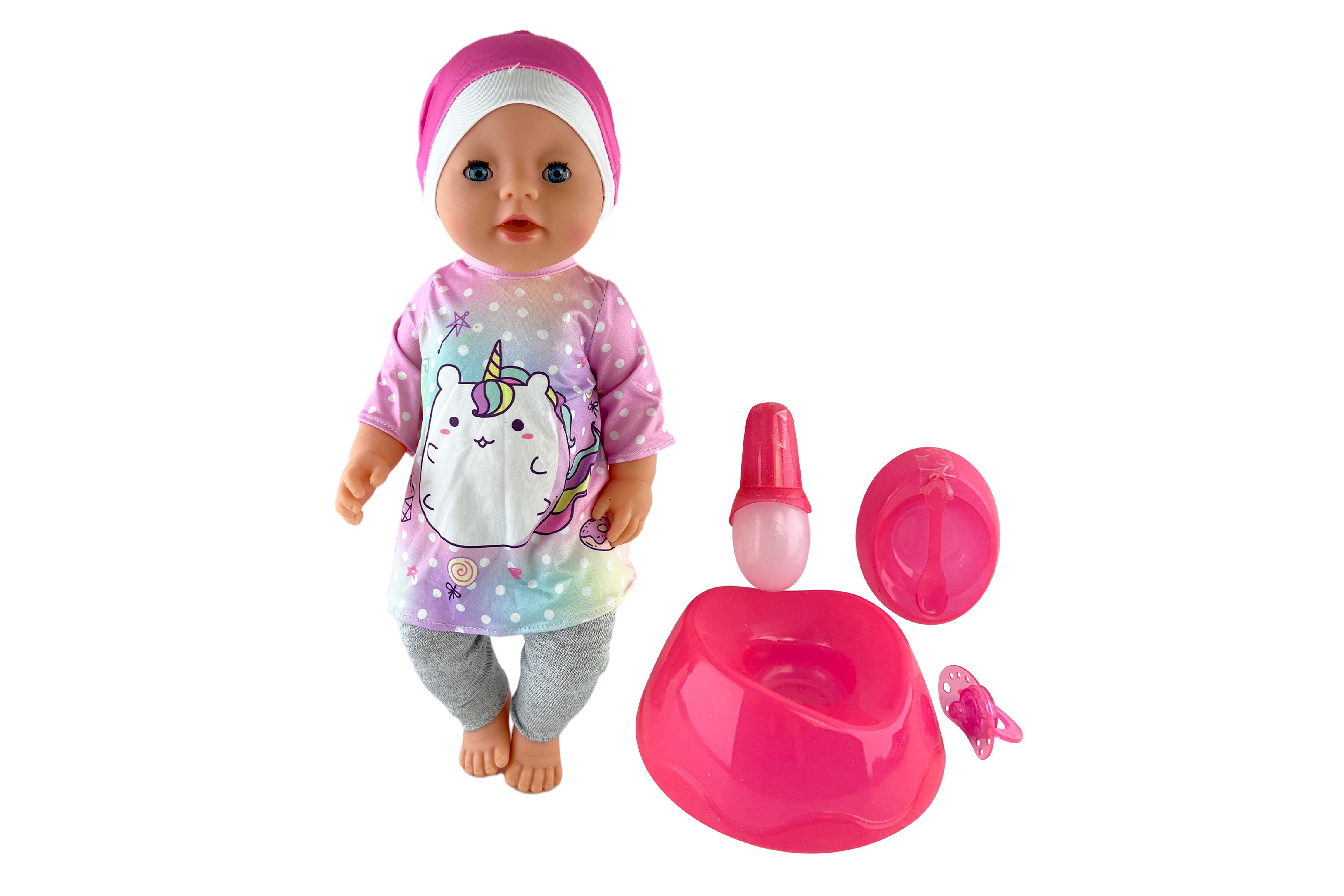Miminko čurající s příslušenstvím. Velikost 45cm. Příslušenství: nočník, miska s lžičkou, lahvička na krmení, plenka, krabička s překvapením, dudlík, průkaz. Miminko se nakrmí vodou pomocí lahvičky. Po zmáčknutí ruky mu tečou slzy. Po stlačení pupíku čurá. Při položení na záda zavře oči.