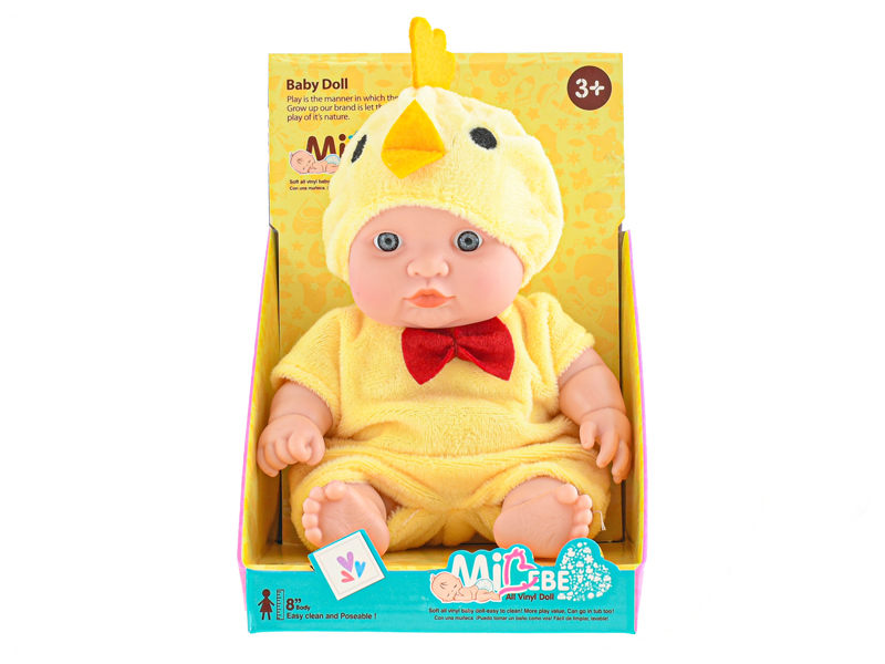 Miminko v oblečku kuřátka 16cm sedící v krabičce