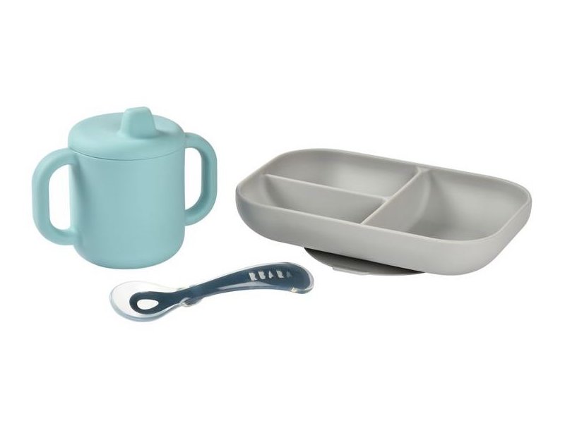 Sada děleného talíře, hrnku na pití a lžičky z vysoce kvalitního silikonu je ideální pro první samostatné krmení.