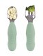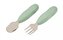 První příbor z kvalitní nerezové oceli s plastovou rukojetí usnadní dítěti přechod od krmení lžičkou k používání příboru. Nerezová vidlička a lžička jsou lehké a díky ergonomickému plastovému držadlu snadno uchopitelné dětskýma rukama. Mělká lžička je ideální pro nabrání malého množství příkrmu, které dítě dokáže donést až do úst. Zakulacené hroty vidličky jsou zárukou bezpečného používání.
