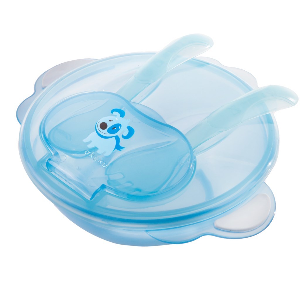Dětská miska se lžičkou Akuku pro děti. Vyrobena z kvalitního plastového materiálu. Lze ohřívat v mikrovlné troubě bez víčka. Určena pro děti od 9 měsíců. Neobsahuje BPA. Rozměry: cca 17x15x5 cm.