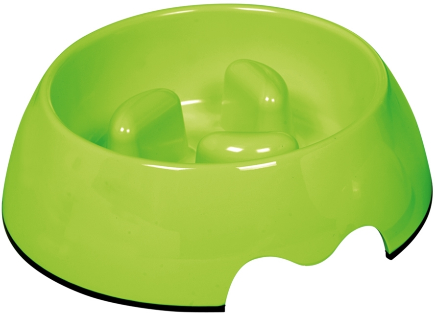Speciální plastová miska uvnitř s výčnělky, které zabraňují psu hltat potravu. Při hltání potravy dochází i k nadměrnému polykání vzduch a následné těžkosti od žaludku. U takového psa je vyšší pravděpodobnost vzniku torze žaludku. Miska je na spodním okraji opatřena protiskluzovou gumou. Vhodné na krmivo i vodu. Melamin je odolný proti nárazům a poškrábání. Lze mýt v myčce. Velikost ø 22 x 7,5cm Objem 750ml.