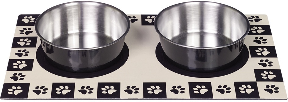 Unikátní magnetická podložka pod misky. Velikost podložky 47 x 28 cm. Dodávané v kompletu s nerezovými miskami o objemu 2x 920ml. Velikost misky ø 16cm. Podložka je z ohebného materiálu. Údržba: podložku čistěte vlhkým hadříkem.
