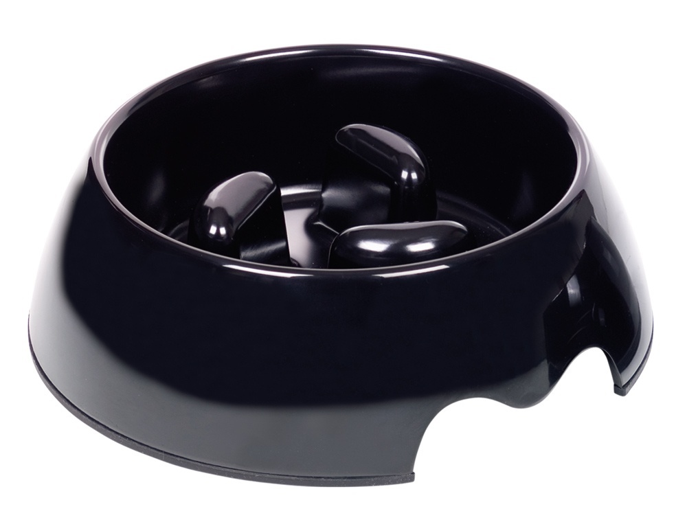 Speciální plastová miska uvnitř s výčnělky, které zabraňují psu hltat potravu. Při hltání potravy dochází i k nadměrnému polykání vzduch a následné těžkosti od žaludku. U takového psa je vyšší pravděpodobnost vzniku torze žaludku. Miska je na spodním okraji opatřena protiskluzovou gumou. Vhodné na krmivo i vodu. Melamin je odolný proti nárazům a poškrábání. Lze mýt v myčce. Velikost ø 22 x 7,5cm Objem 750ml.