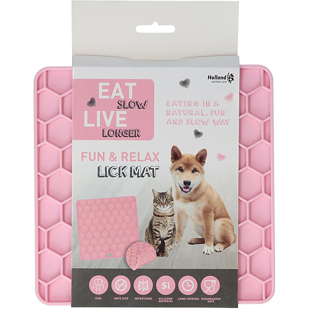 Lízací podložka Eat Slow Fun & Relax má mnoho silikonových přísavek, proto skvěle drží na hladkém povrchu, což oceníte při koupání, fénování, rozčesávání nebo jiném neoblíbeném ošetřování. Je skvělá jako zpomalovač jedení či pro zábavnou lízací hru, v létě jí můžete zamrazit i s dobrotami a dopřát tak pejskovi mlsné ochlazení. Podložka Eat Slow Fun & Relaxe je vyrobená ze 100% potravinářského silikonu a na spodní straně ma 49 efektivních přísavek, díky kterým bude na hladkém povchu držet jako přibitá!
