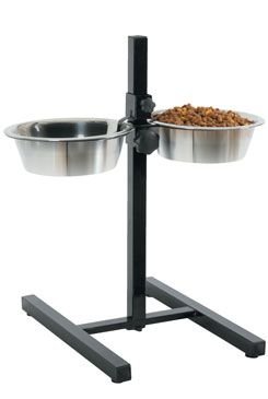 Stojan na misky v černé barvě. Dvě misky 1,5l jsou součástí balení.Nastavitelný stojan je vhodný pro střední plemena.Výška stojanu maximálně 46 cm. Výškové umístění misek je nastavitelné.Rozměry: 460 x 395 x 515 mm