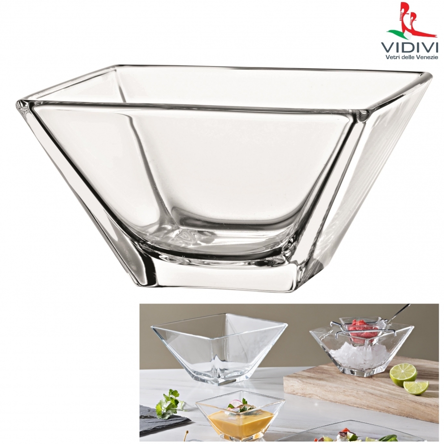 Skleněná mísa v jedinečném čtvercovém designu s jemnými geometrickými tvary. Ideální pro servírování ovocných a zeleninových salátů atd. Je vyrobená z kvalitního luxusního italského skla(sklo z Benátek) s vysokým stupněm transparentnosti, lesku a pevnosti. Propracované výrobky se budou vyjímat na každém stole. Vidivi výrobky vynikají jednoduchostí, čistotou tvarů, pevností a robustností. Rozměr - 20 x 20 cm, objem - 1,8 l, výška - 11 cm, hmotnost - 1,089 kg, vhodné do mikrovlnné trouby a myčky