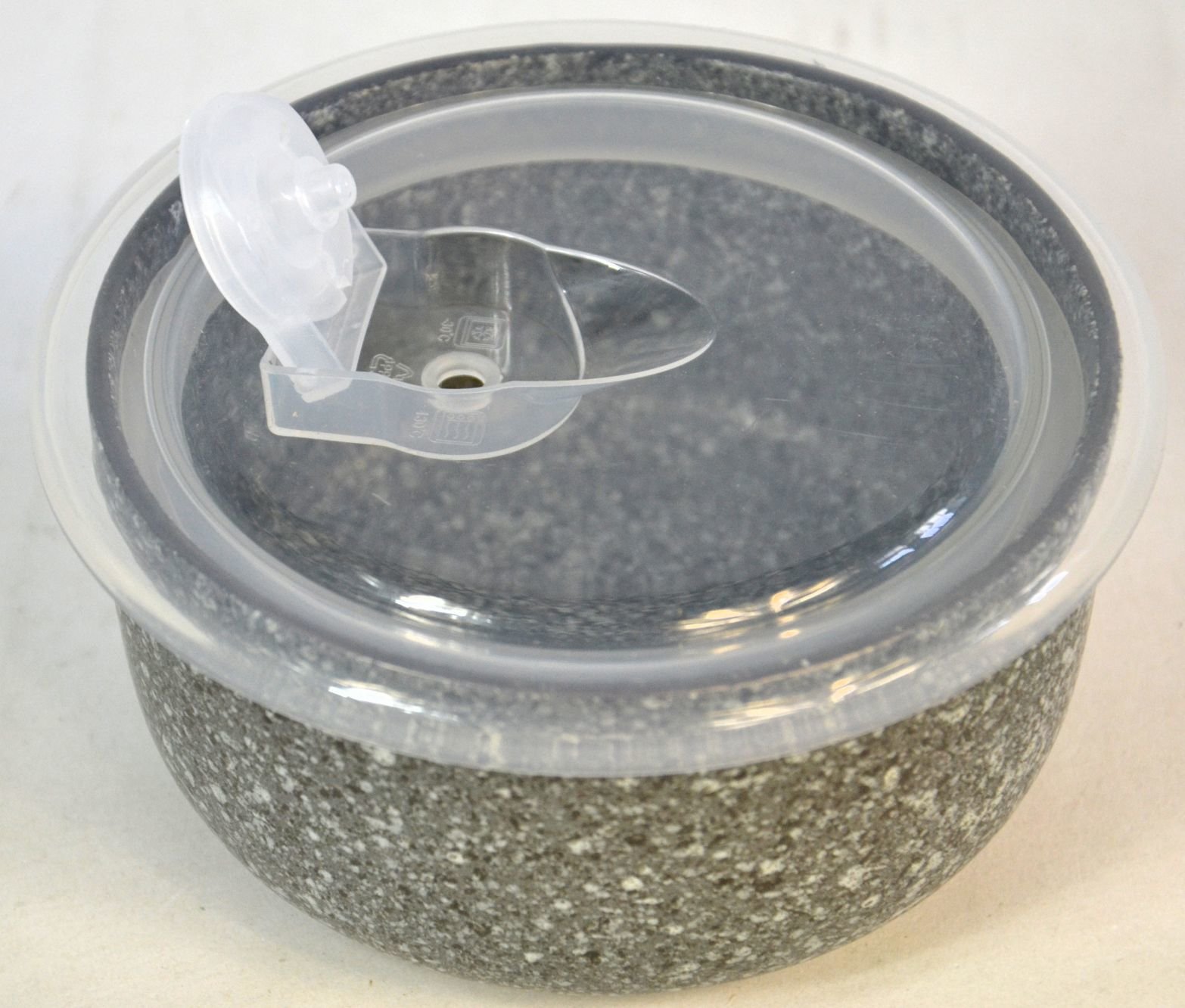 Miska s víčkem s otvorem pro odvod přebytečné páry. Materiál - kamenina, plast. Rozměry - 12,7x6,5cm.