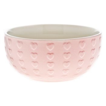 Růžová miska s dekorem srdce o objemu 500 ml. Materiál - keramika. Rozměry - výška 6,6 cm, průměr 13,5 cm.