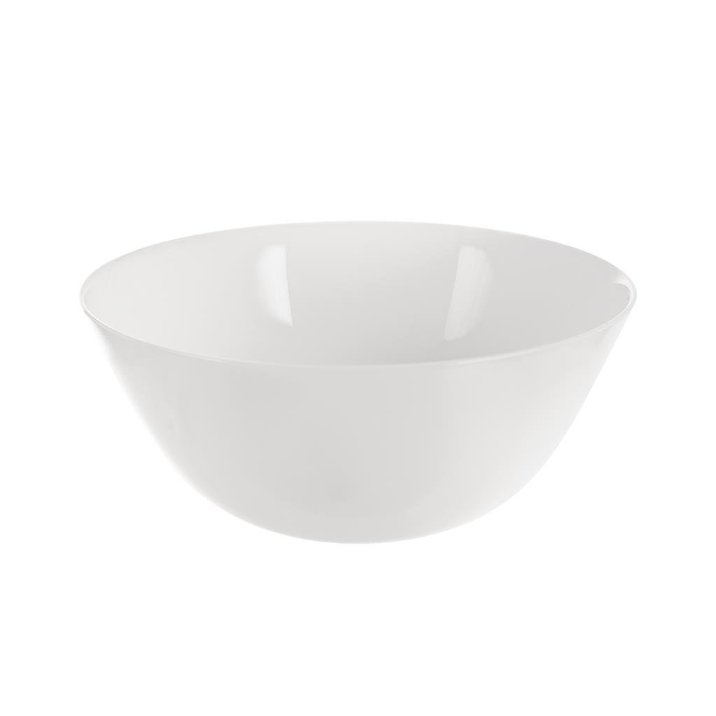 Středně velká klasika z bílého, tzv. opálového skla, to je mísa na saláty, ovoce, zeleninu, servírování drobného slaného pečiva i polévku.