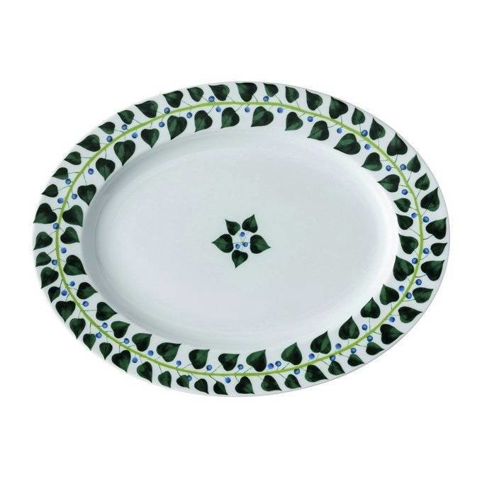 Novinka roku 2020 firmy Rosenthal vychází z magické atmosféry tzv. lékařských zahrad - hortus medicus. Oválný talíř o průměru 32 cm, z bílého porcelánu, je dekorovaný po celém okraji a ve svém středu zelenými listy exotické liány s pučícími kvítky v modré barvě, patří do kolekce Magic Garden, s designem Foliage. Používat jej můžete nejen jako talíř servírovací, ale také jako jídelní při servírování ryb a mořských plodů.