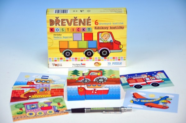 Z nepřeberného množství dřevěných kostek, které v současnosti na trhu najdeme, mě tyto zaujaly hlavně tím, že na nich najdeme krásné obrázky dopravních prostředků, nechybí lodička, mašinka, letadlo, hasičské auto...