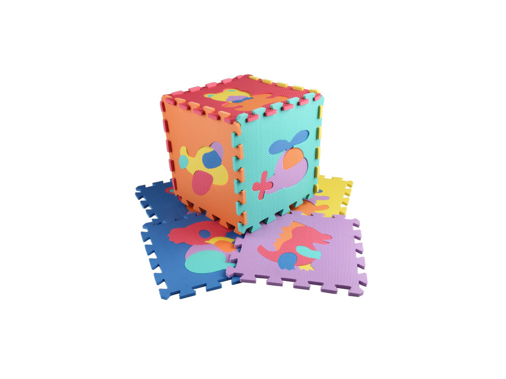 Pěnové podlahové puzzle s vroubkovaným povrchem a vyjímatelnými částmi o velikosti cca 32cmx32cmx10mm. V balení 10ks podložek. Barevné čtverce s motivem zvířátek a dopravních prostředků.