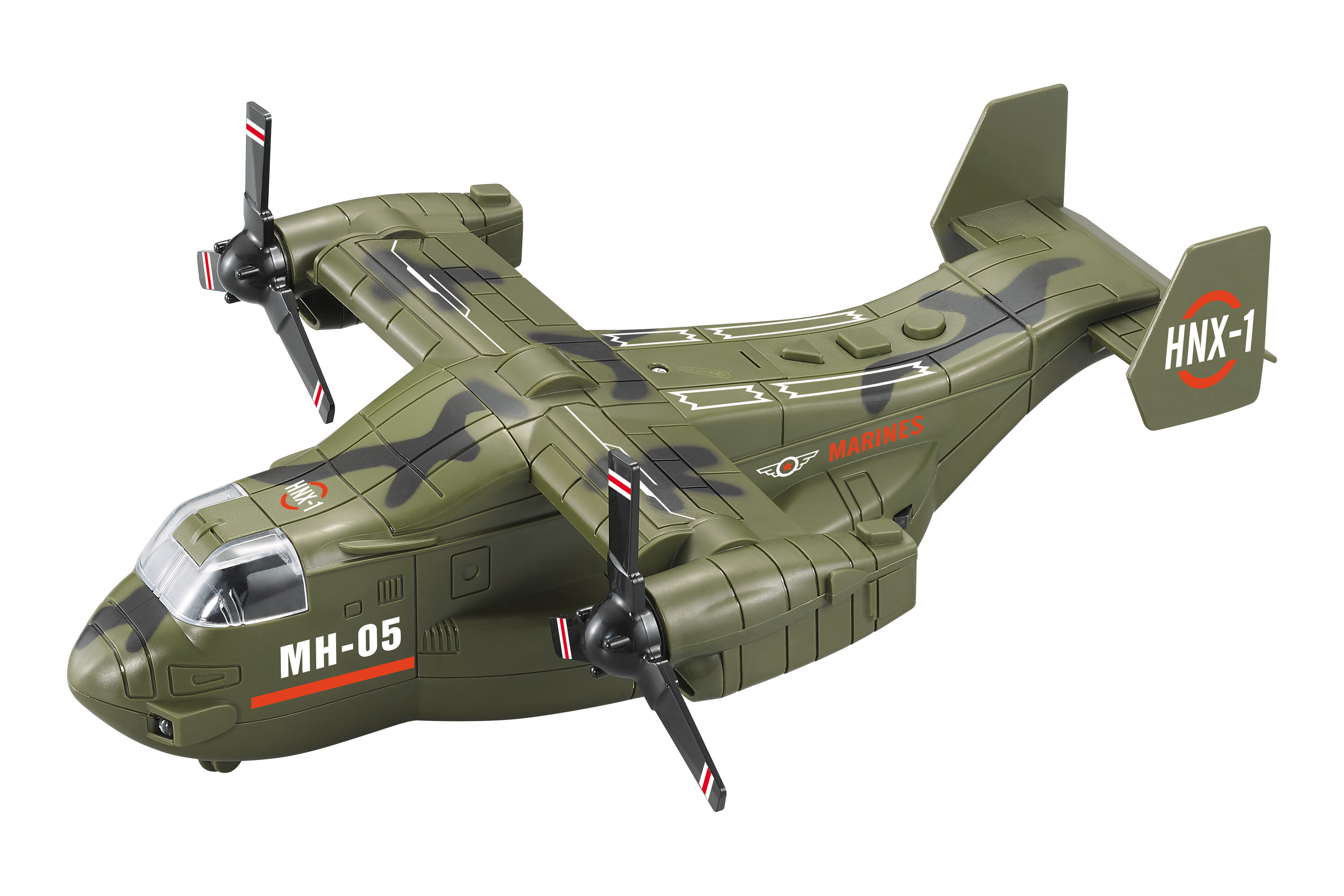 Letadlo s vertikálním vzletem. Velikost 28 x 24,5 x 9,6 cm. Se zvukovými a světelnými efekty. 3xAG13 baterie součástí. Aktivace tlačítky na střeše. Vrtule lze polohovat horizontálně i vertikálně. Otáčením válečku mezi křídly se točí obě vrtule. Na setrvačník. číst celé