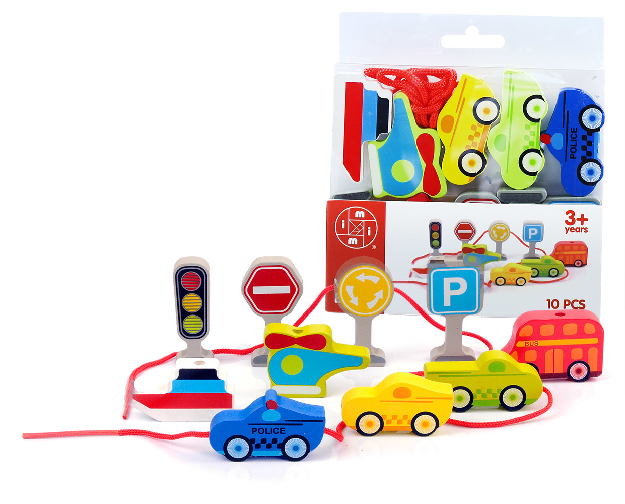 Veselé barevné dopravní prostředky. Výrobek je ze dřeva a díky otvoru v každém z tvaru, se dají navlékat na šňůrku. Sada obsahuje 10 dílů + šňůrku.