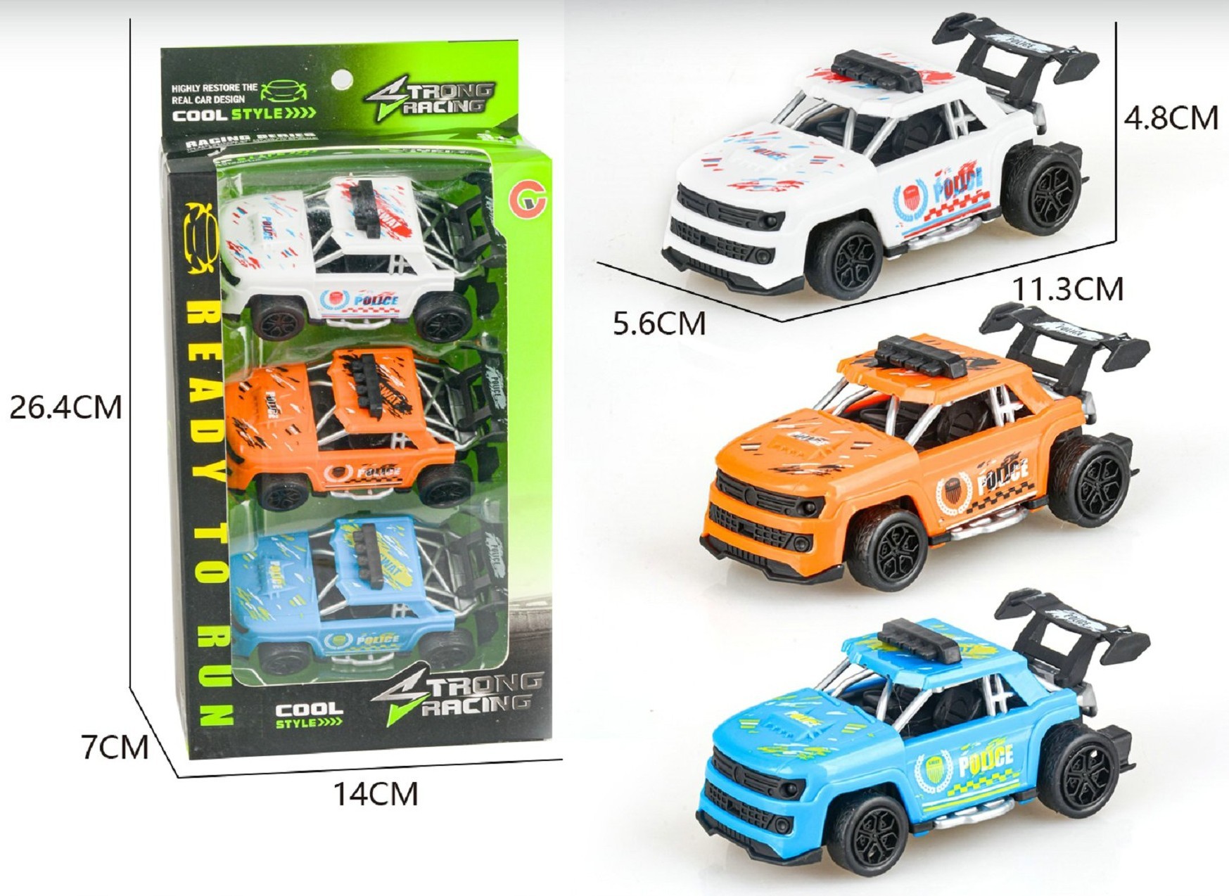 Auta policejní 3 ks. Rozměry 11x5,5x5 cm. Na zpětné natažení. číst celé