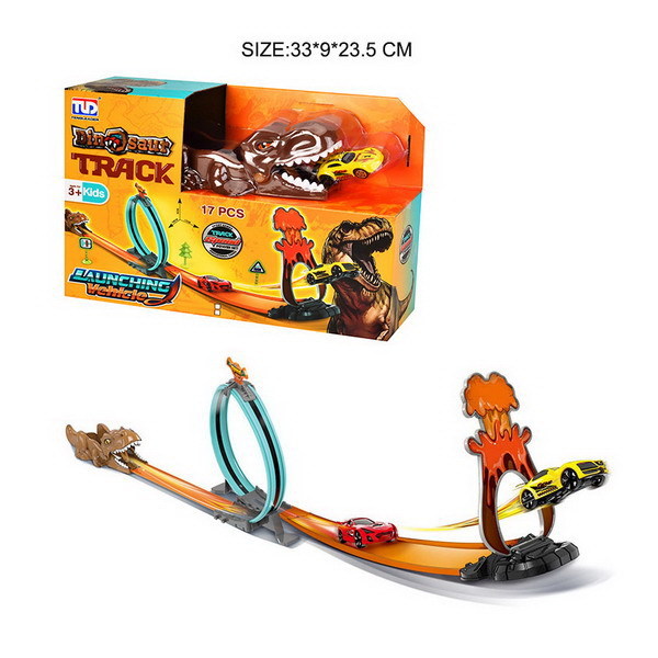 Vystřelovací dráha dino s autem. Rozměry 106x17x30 cm. Součástí 1 auto, volná kola. číst celé